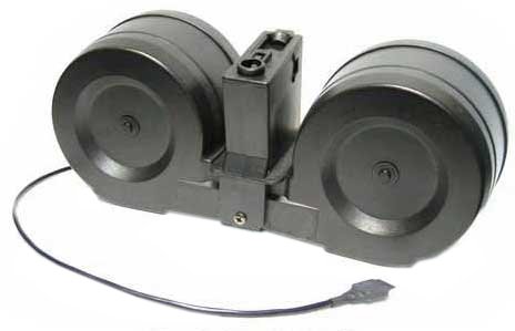Echo1 M4 2500, Echo1 M4 2500 Round Electric C-Mag A double barrel style magazine made by Echo1 for M4 mag compatible AEGs. The C-Mag is auto winding, using a 9v battery connected to a pressure switch that powers the winding motor. Features:
